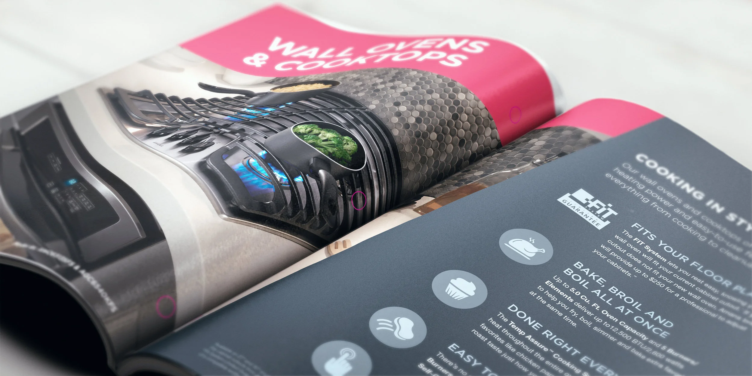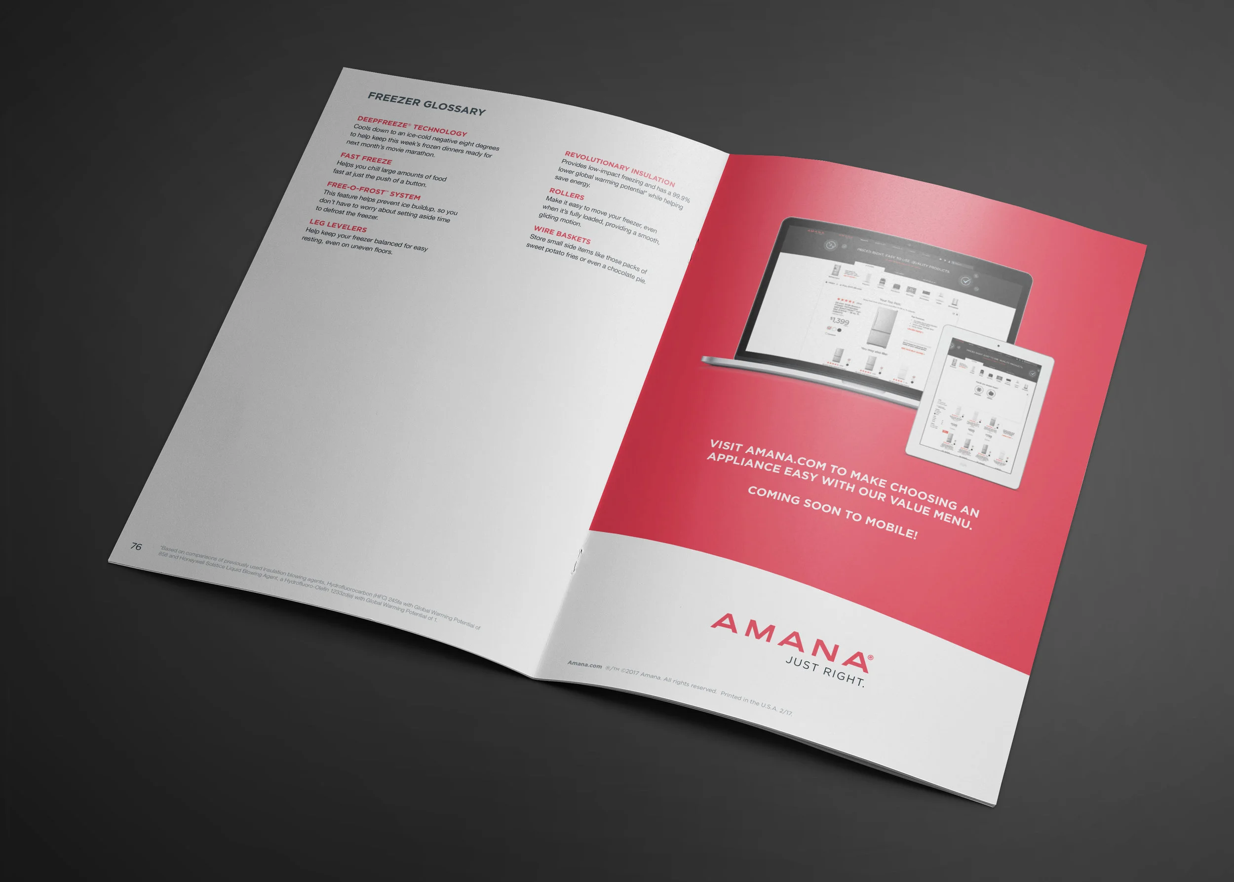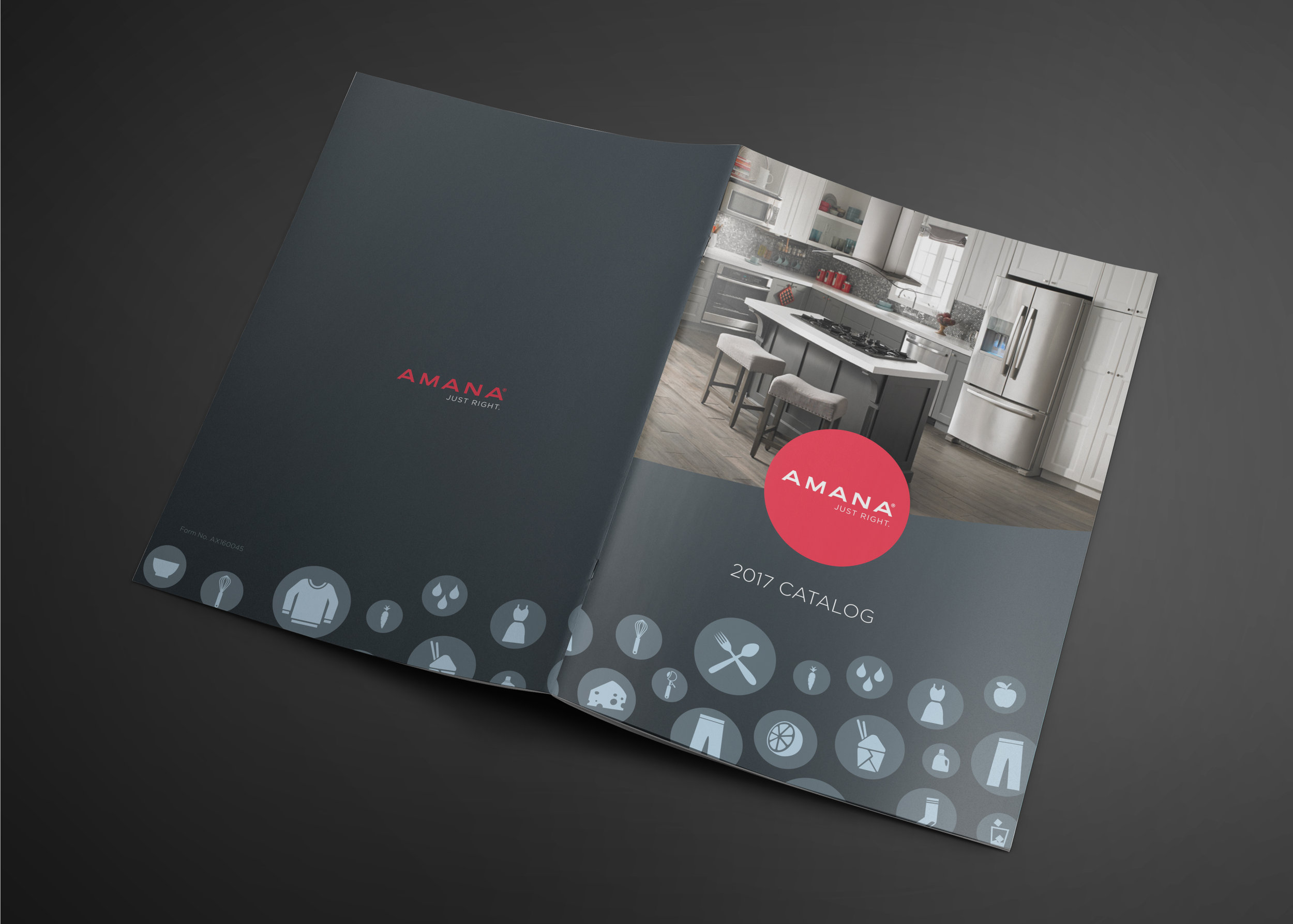 Every year, Amana releases a brand catalog that outlines new appliance models and exciting brand innovations for sales associates to better sell product in-stores. To match our bold design approach for 2017, I applied striking red and dark gray banners against our rich, full-bleed photography.