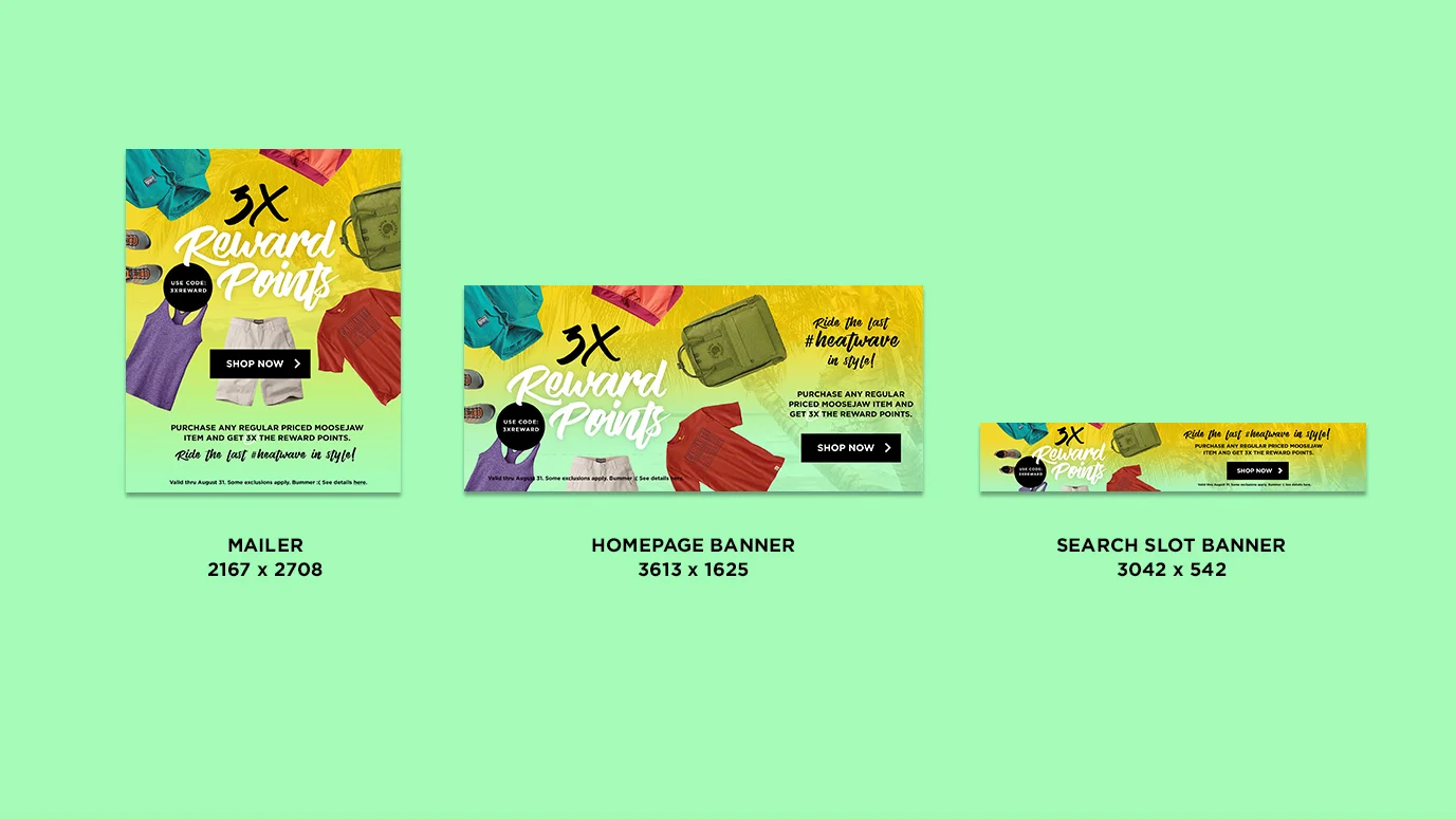 The goal was to build excitement about Moosejaw's digital summer promotion with trendy and fun advertisements. This is an update of the original version.