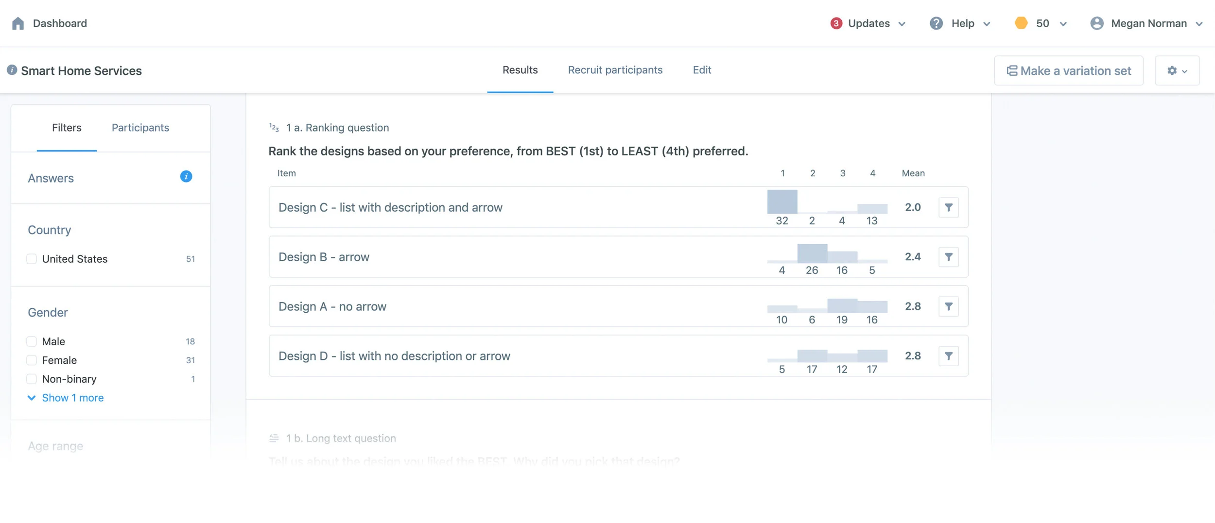 That’s where Usability Hub comes in. This route proved to be a much more simple process. We were able to to add parameters such as age, tech savvy-ness, education level, etc. to recruit participants that matched our myQ user personas. I then created and uploaded a side-by-side preference test which asked the following questions: