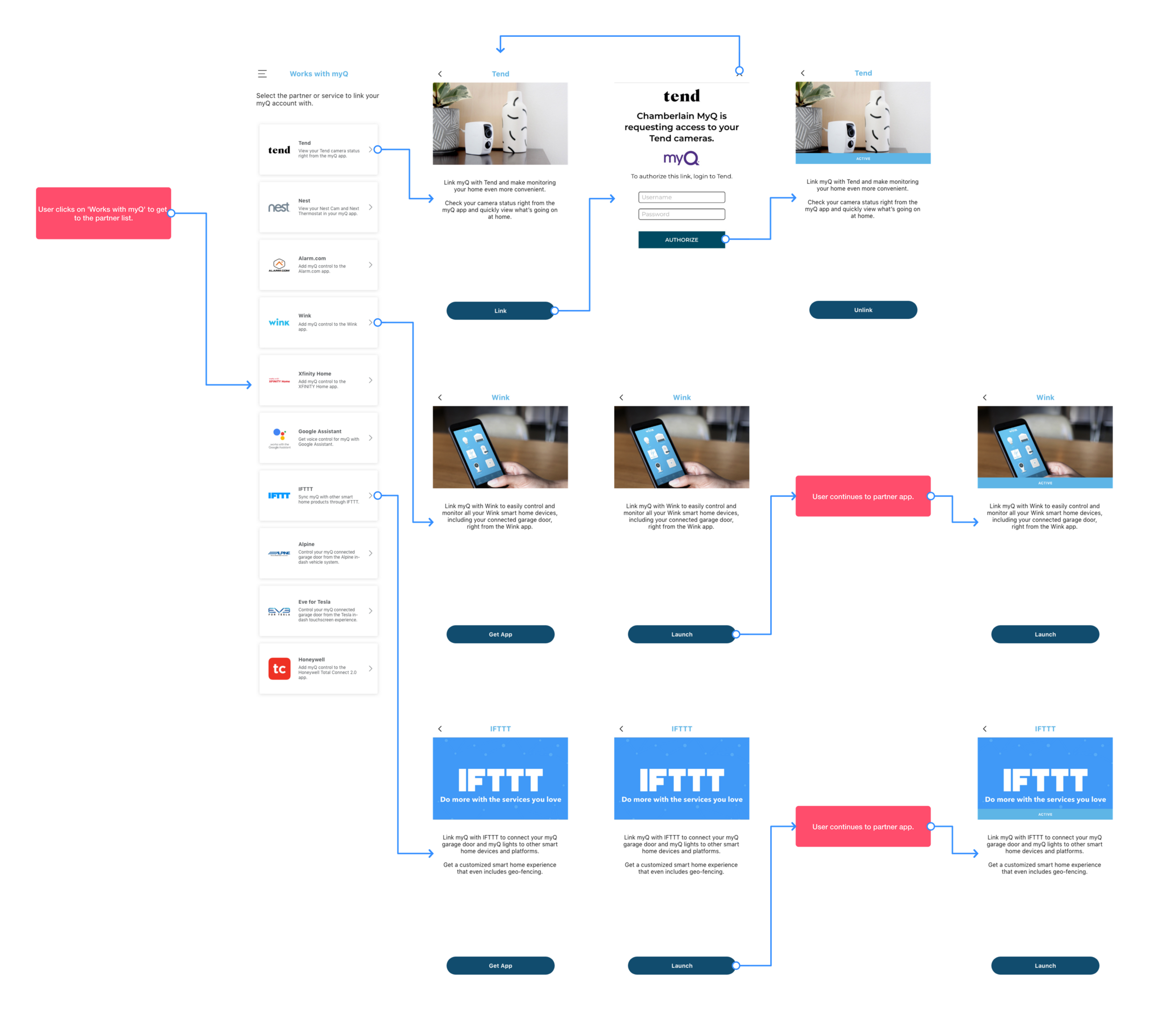 Now that we had the design, I could flesh out the remaining wireframes to complete the user flow, which includes the partner list (tested screen), partner details page, authorization screens and active subscription screens.