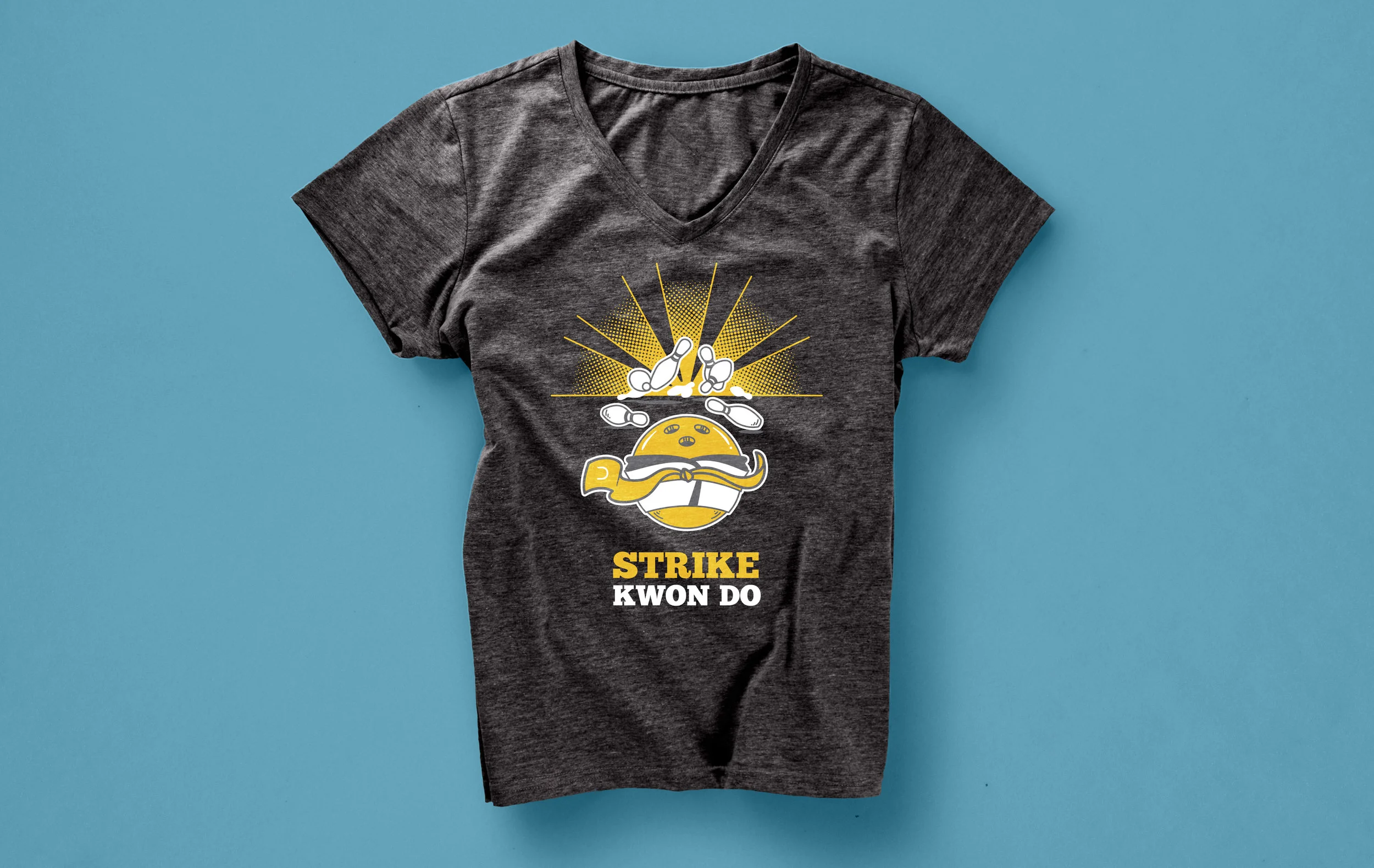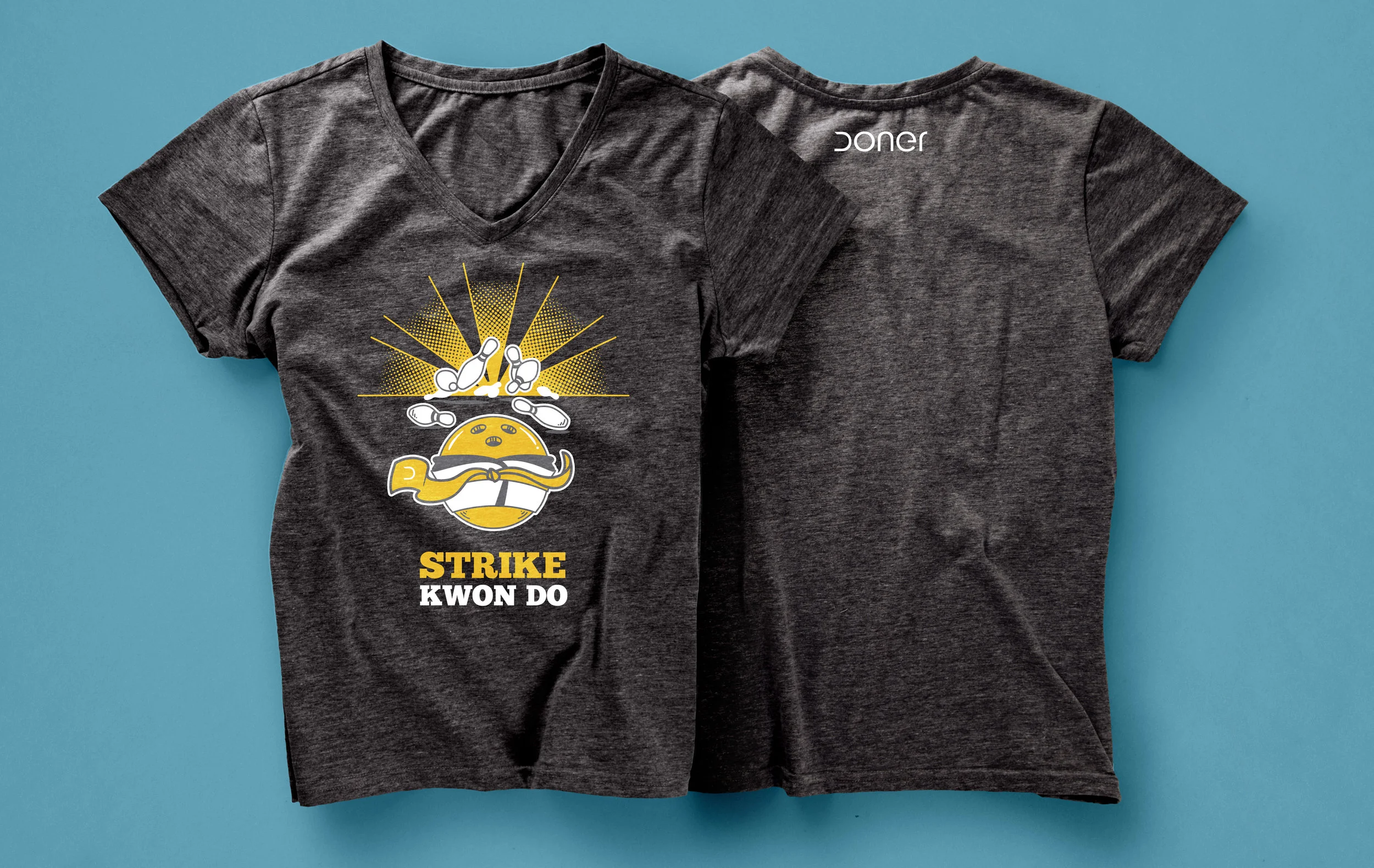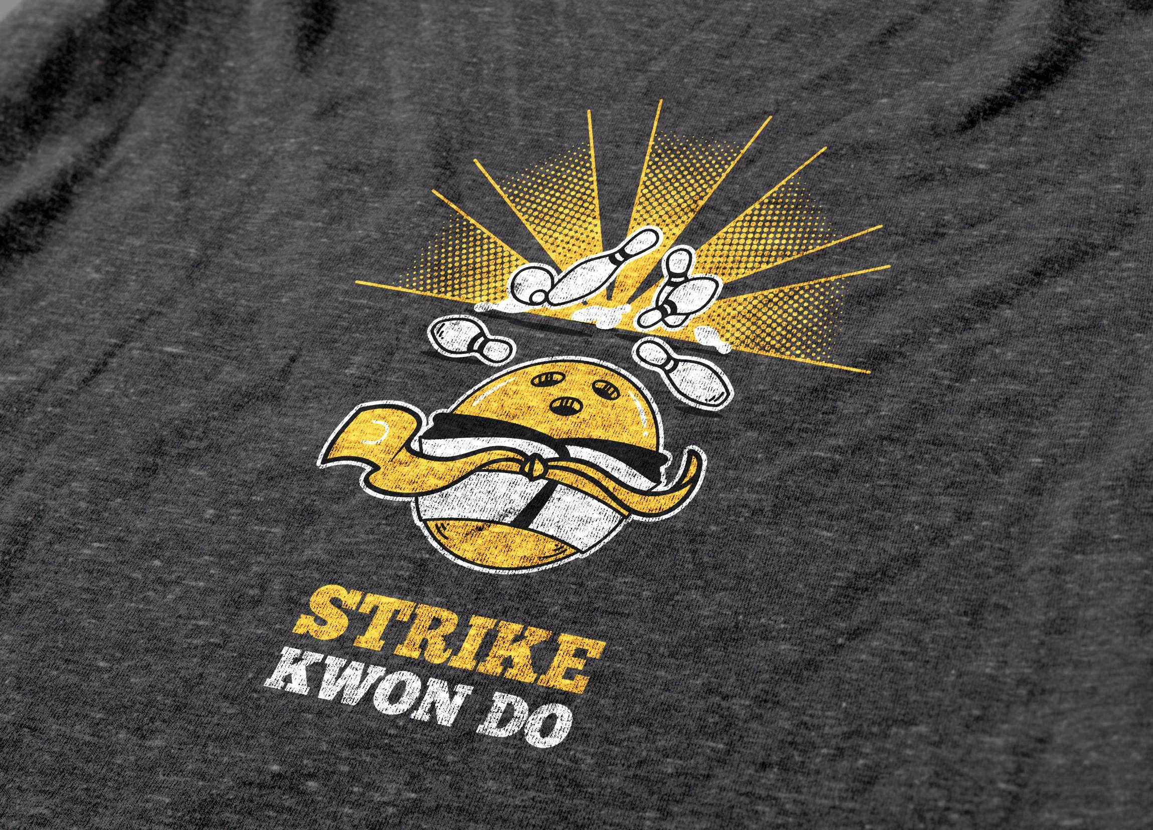 When designing t-shirts for the Doner bowling league, Strike Kwon Do, I used a quirky illustrative style to play off the name.